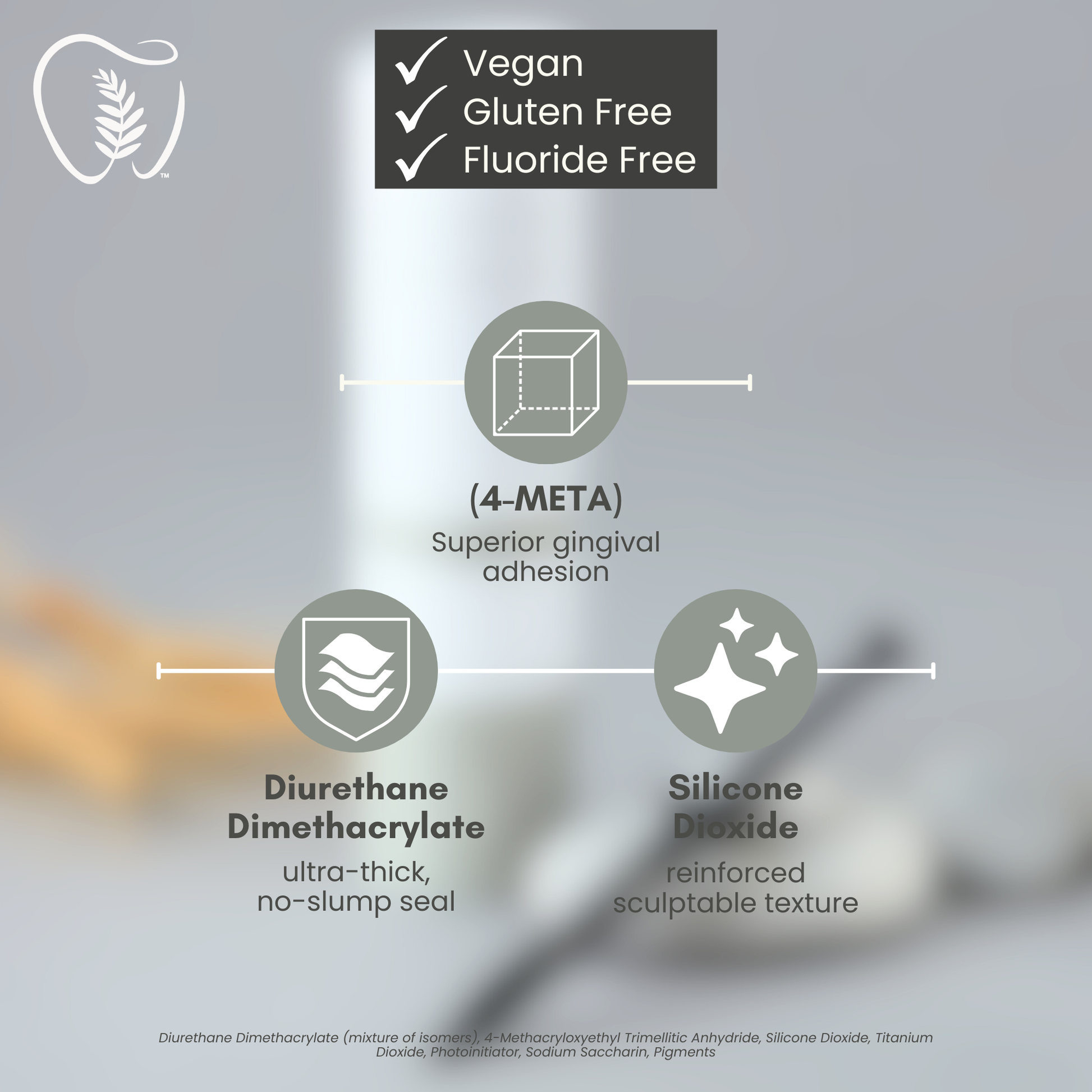 Diurethane Dimethacrylate (mixture of isomers), 4-Methacryloxyethyl Trimellitic Anhydride, Silicone Dioxide, Titanium Dioxide, Photoinitiator, Sodium Saccharin, Pigments